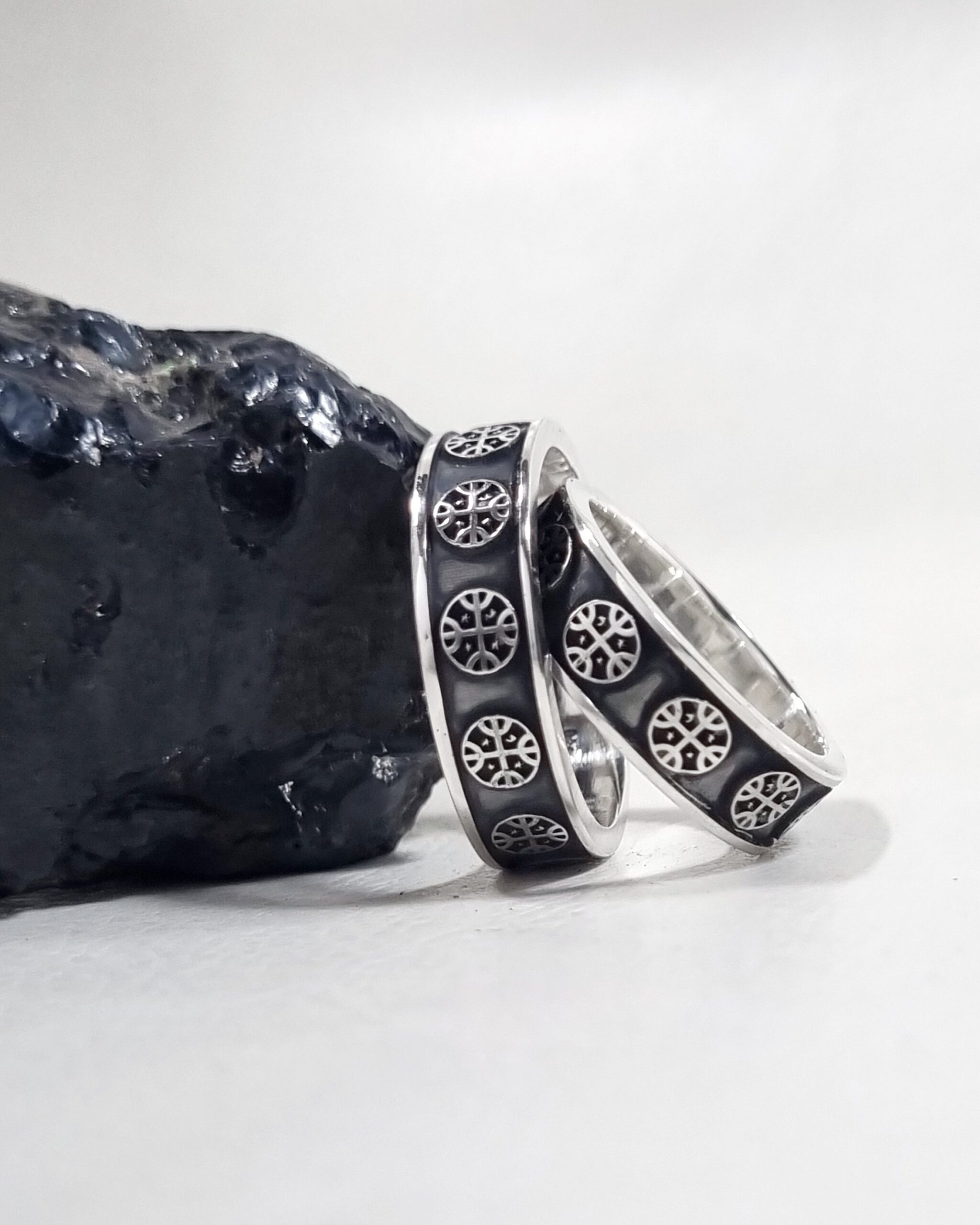 Anillo inspirado en tambor ceremonial mapuche, hecho en plata ley 950 y precisión en el tallado.