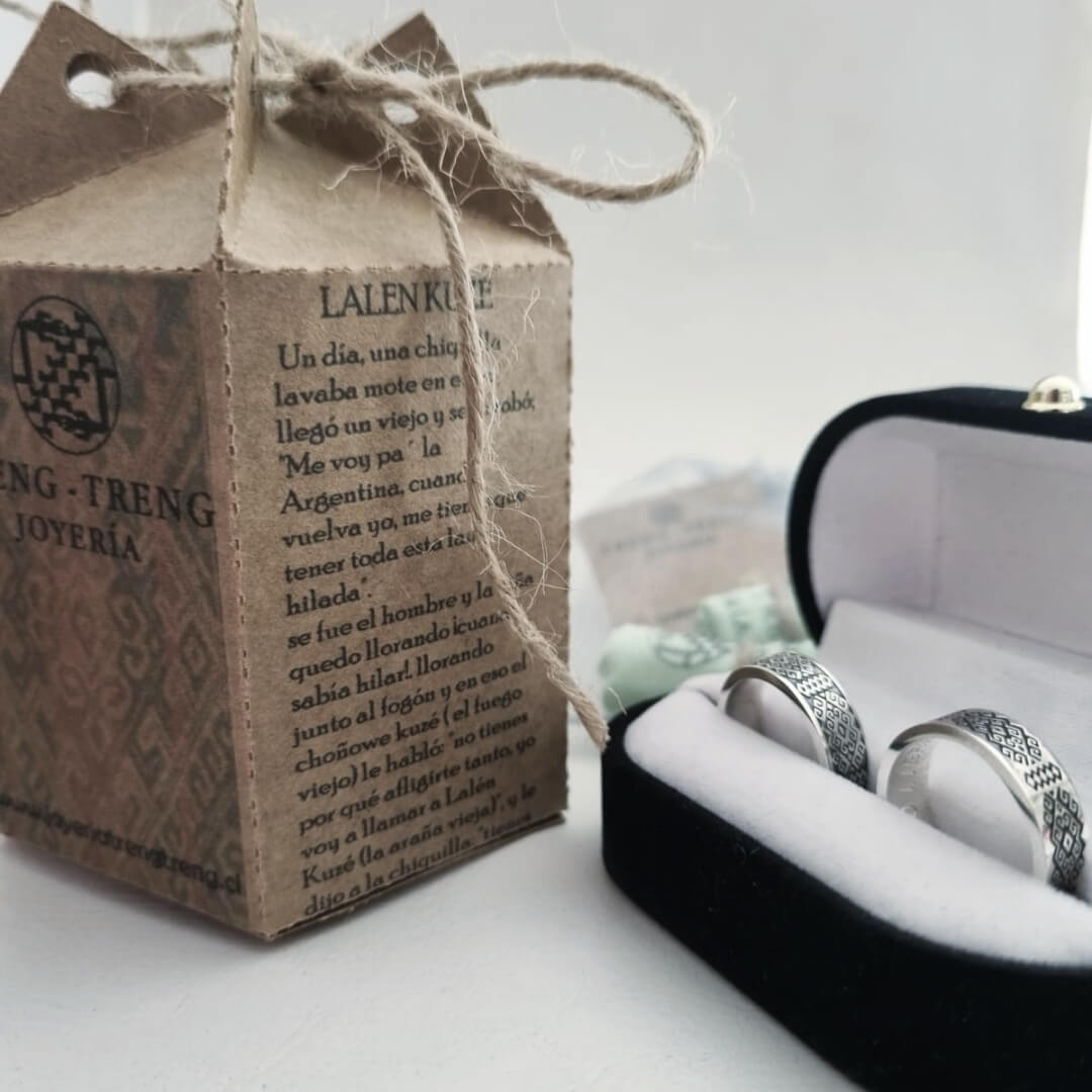 Este anillo es mucho más que joyería; es un homenaje a Lalen Kuze (la Araña Vieja), la gran maestra tejedora de la cosmovisión mapuche. Según la tradición, ella es quien transmite el conocimiento del telar y la paciencia necesaria para entrelazar las historias en el tejido.