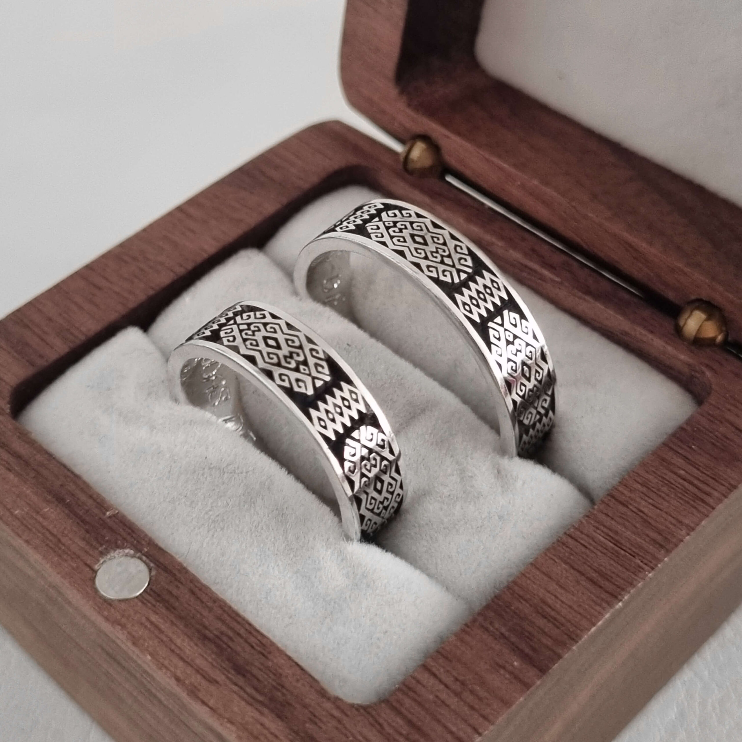 Formato Claro (Bajo Relieve): Una versión más integrada donde el diseño textil fluye por toda la superficie de la argolla sin marcos laterales.