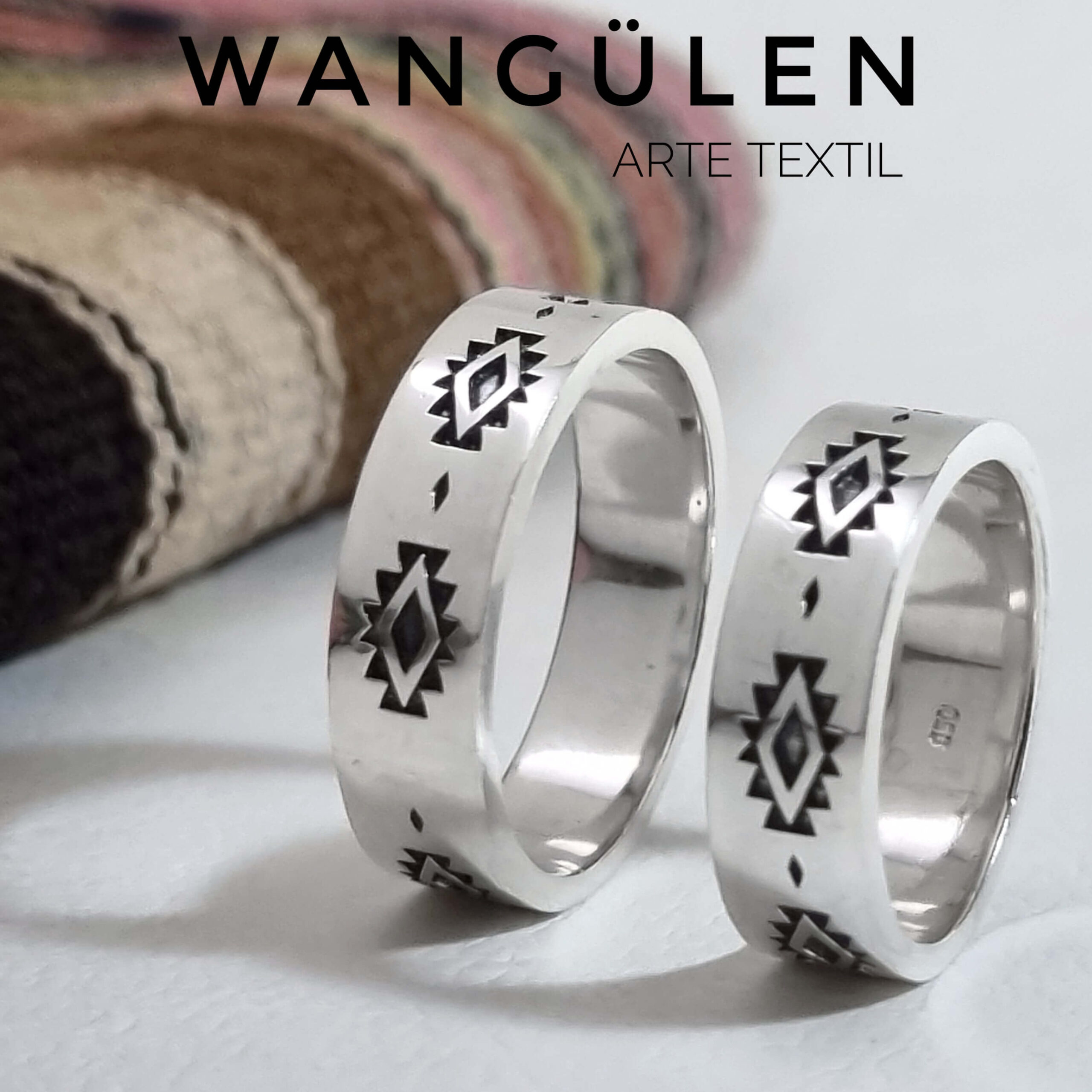 El diseño Wangulen , lo encontramos en textiles y esta inspirado en la cosmovisión mapuche, representa la conexión entre el hombre, la naturaleza y el universo. La forma fluida y los patrones que adornan el anillo evocan la armonía y el equilibrio, reflejando la importancia de la tierra. fisicamente es un lucero o estrella.