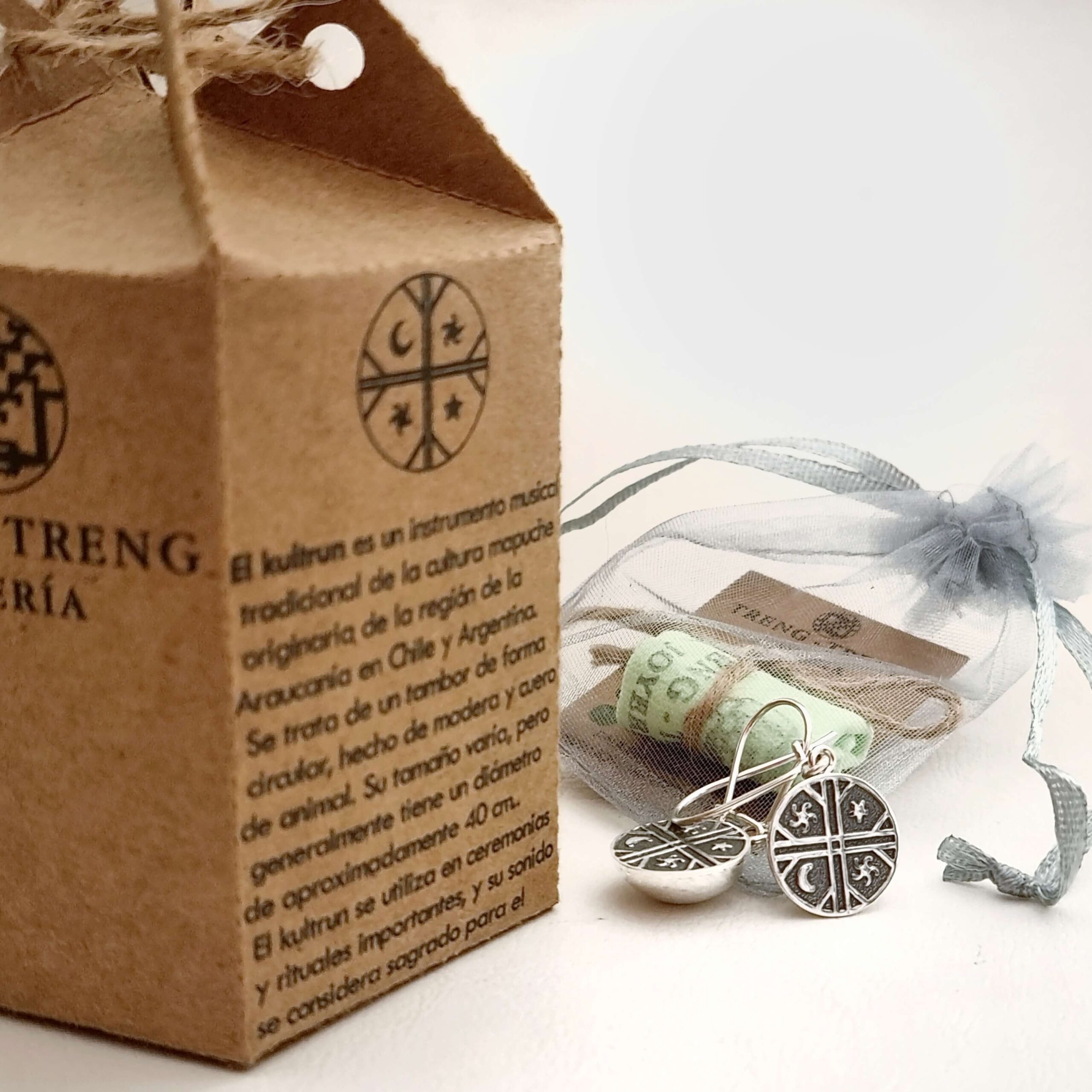 Una réplica fiel del símbolo mapuche del kultrun: un pequeño tambor de plata que reproduce los cuatro cuadrantes cosmos‑tierra en consonancia con la cosmovisión mapuche, en la que ese tambor representa el universo, los puntos cardinales y el equilibrio entre fuerzas naturales. Esta joya gira en torno a la armonía y la conexión ancestral con la tierra y el cielo.