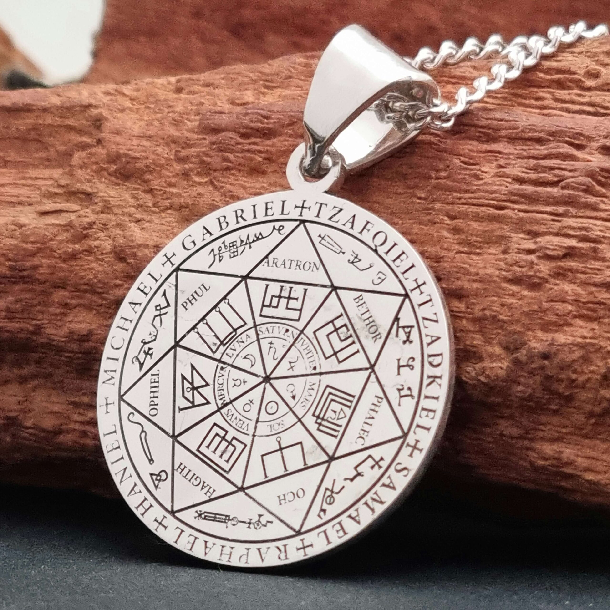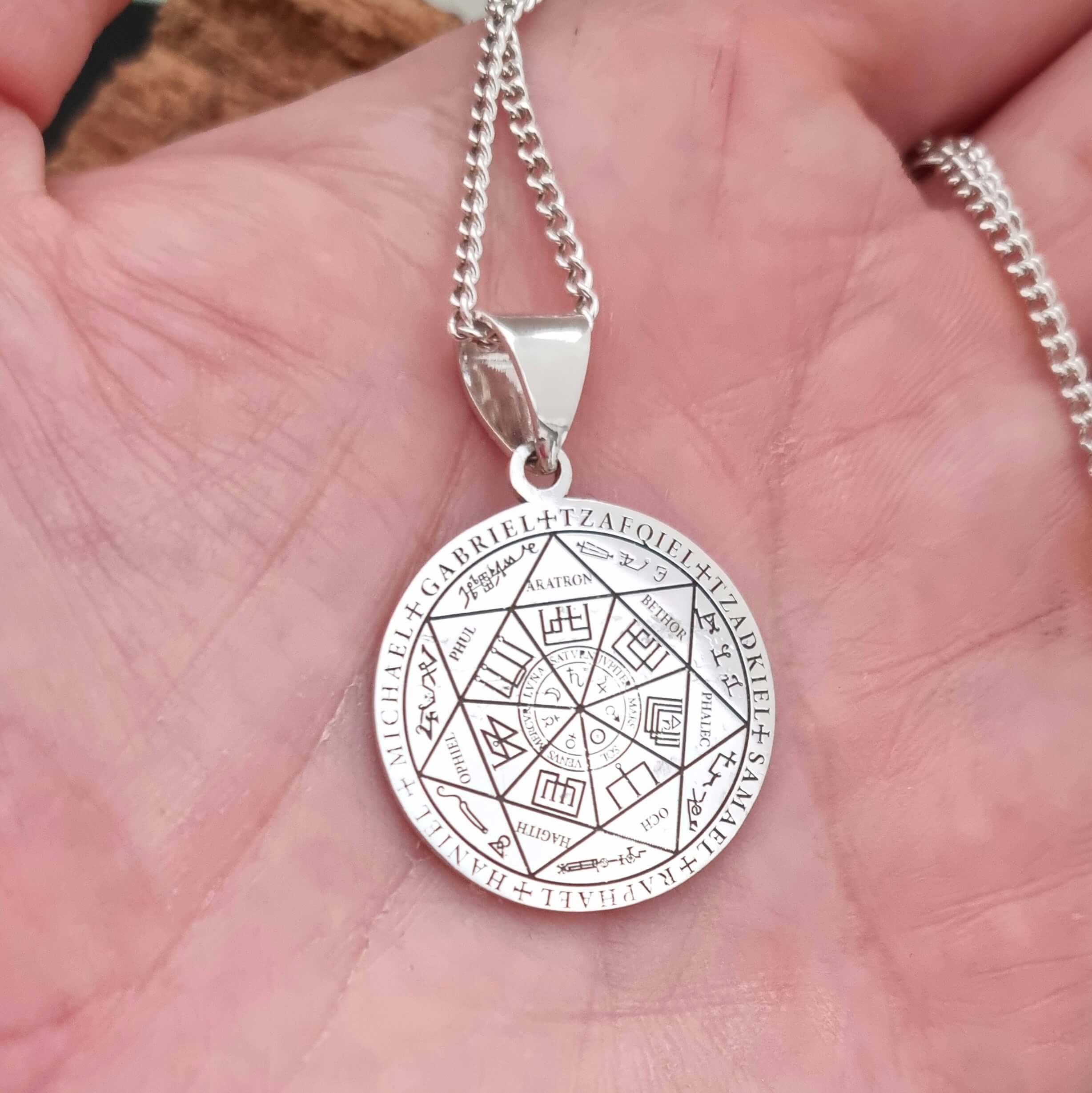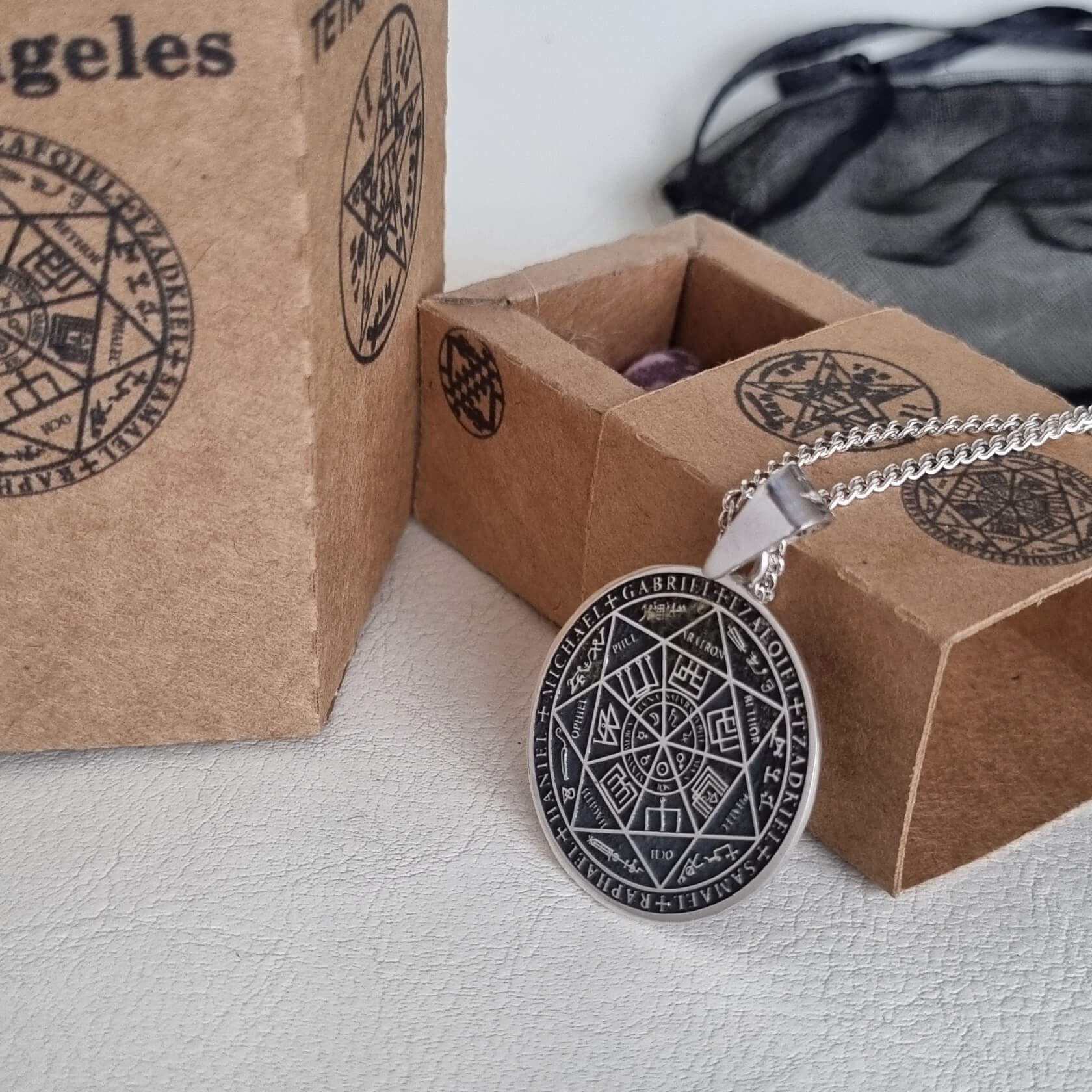 Medalla reversible elaborada en plata ley 950 (Chile), de 2,5 cm de diámetro. Una cara presenta el Tetragramatón, símbolo tradicional de protección, equilibrio y poder espiritual, con grabado detallado de sus elementos esotéricos. La otra cara representa a los 7 Arcángeles mediante una composición simbólica, asociada a la guía, defensa y conexión con planos superiores. Pieza artesanal de alto contenido simbólico, ideal como talismán o accesorio espiritual.