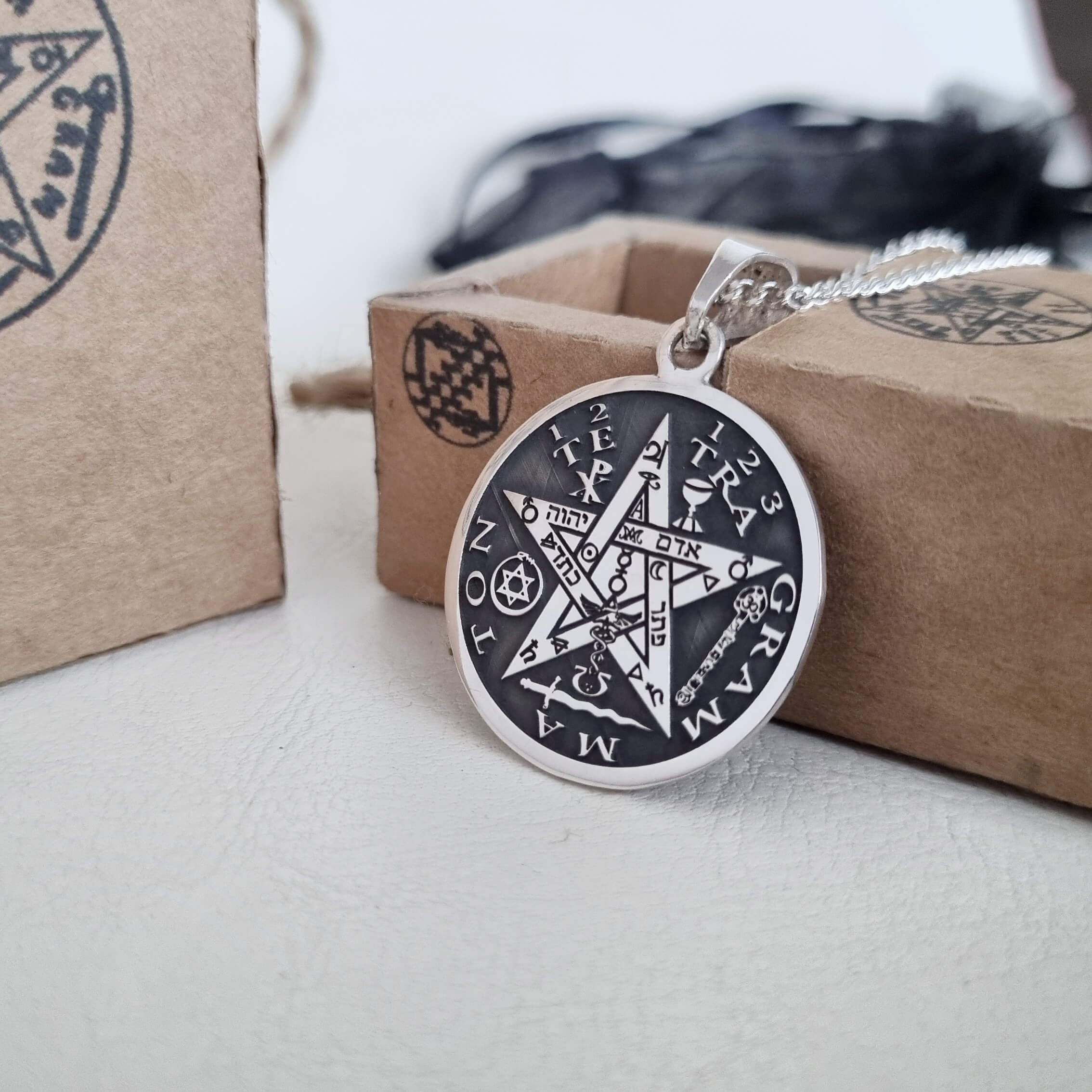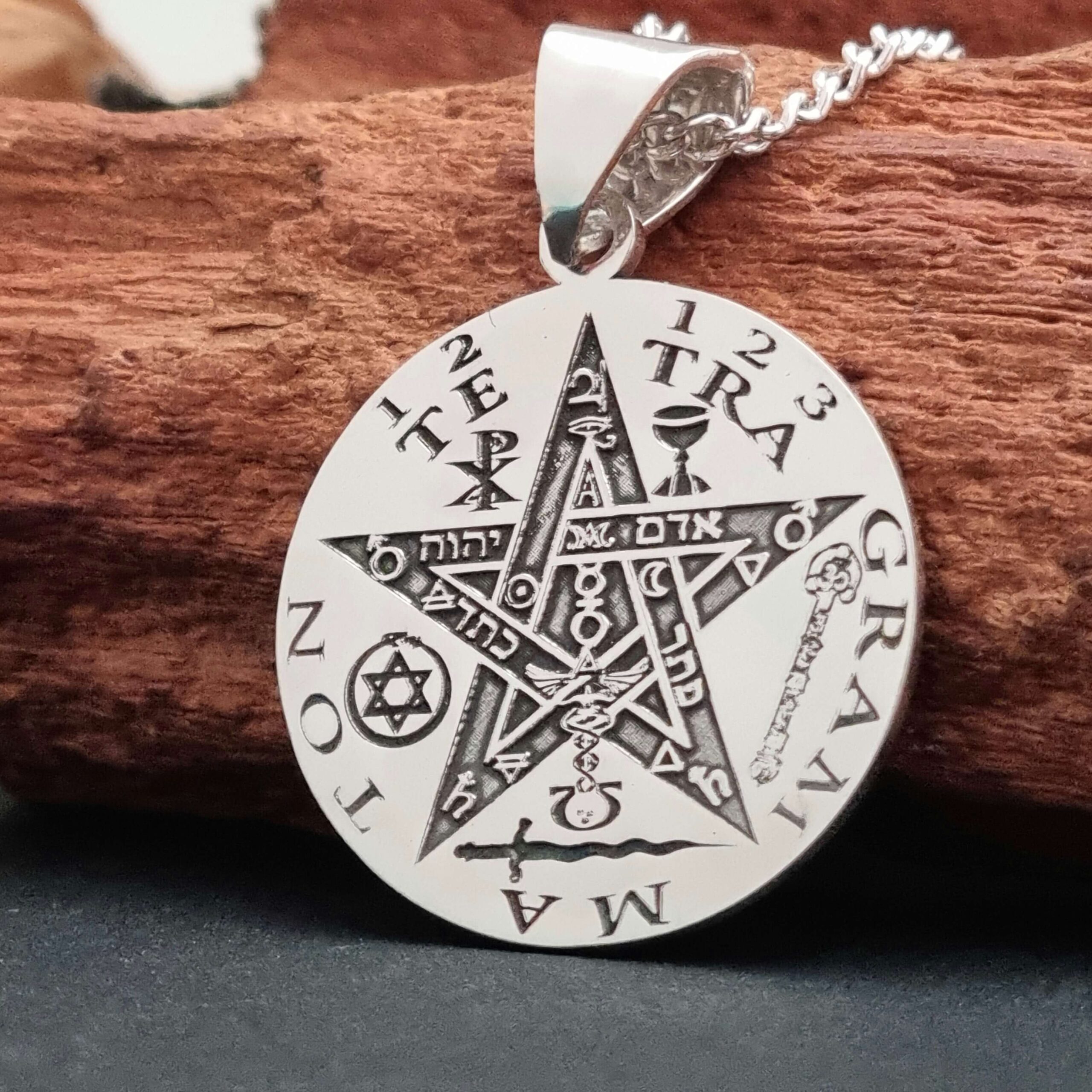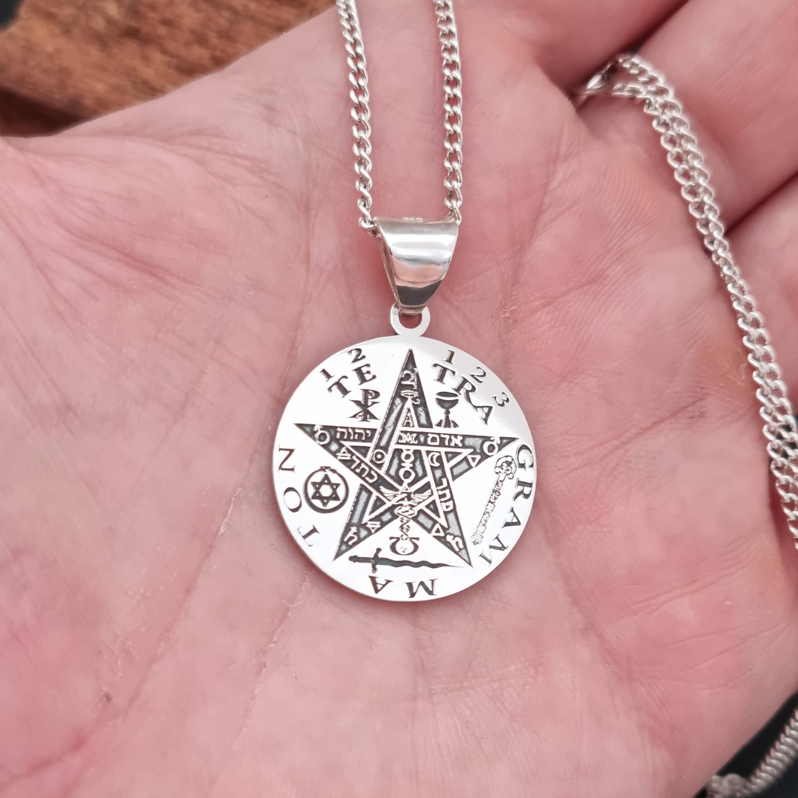Medalla reversible elaborada en plata ley 950 (Chile), de 2,5 cm de diámetro. Una cara presenta el Tetragramatón, símbolo tradicional de protección, equilibrio y poder espiritual, con grabado detallado de sus elementos esotéricos. La otra cara representa a los 7 Arcángeles mediante una composición simbólica, asociada a la guía, defensa y conexión con planos superiores. Pieza artesanal de alto contenido simbólico, ideal como talismán o accesorio espiritual.
